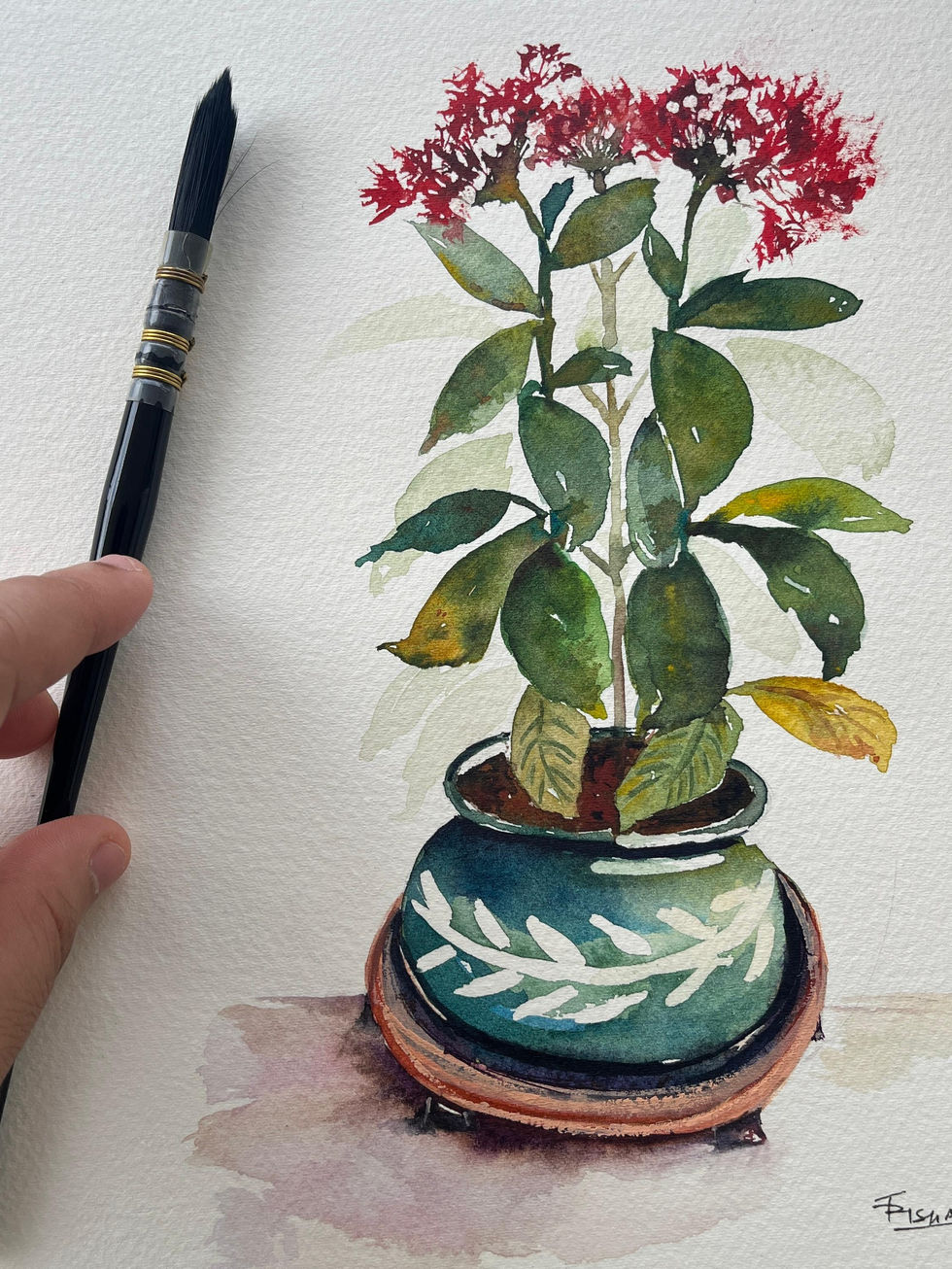 Bring the vibrant charm of red Pentas (also called Lucky Star) into your space with this timeless watercolor print, showcasing their characteristic edgy blooms nestled in a vibrant green artisan pot.