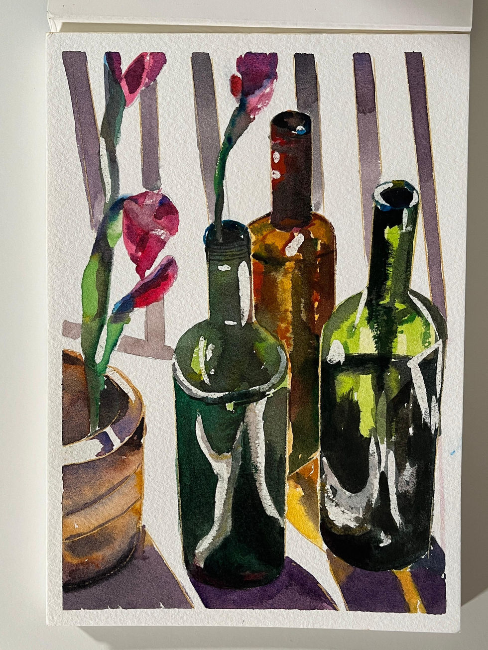 The piece captures three empty wine bottles in characteristic bottle green and warm rust tones, bathed in soft sunlight streaming through the balcony. Each bottle has its own story to tell, with one adorned by a single delicate pink flower stalk, a quiet ode to simplicity. An earthen pot, almost forgotten, sits nearby, with the same pink flower stalks that contrast beautifully with the structured glass and earthy tones.